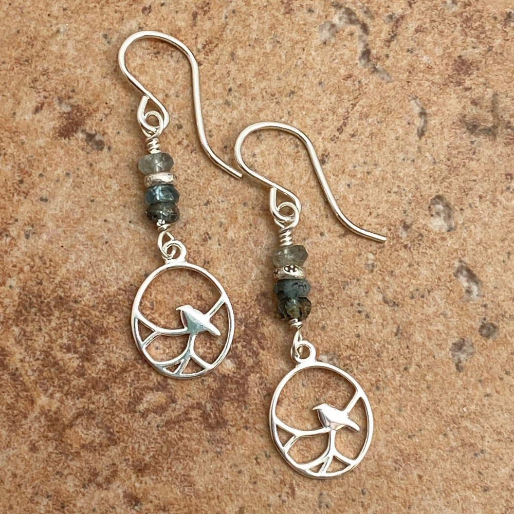 A stack of tri-colored teal blue Moss Aquamarines and fine silver decorated beads from Thailand holds a lovely sterling silver bird charm.
