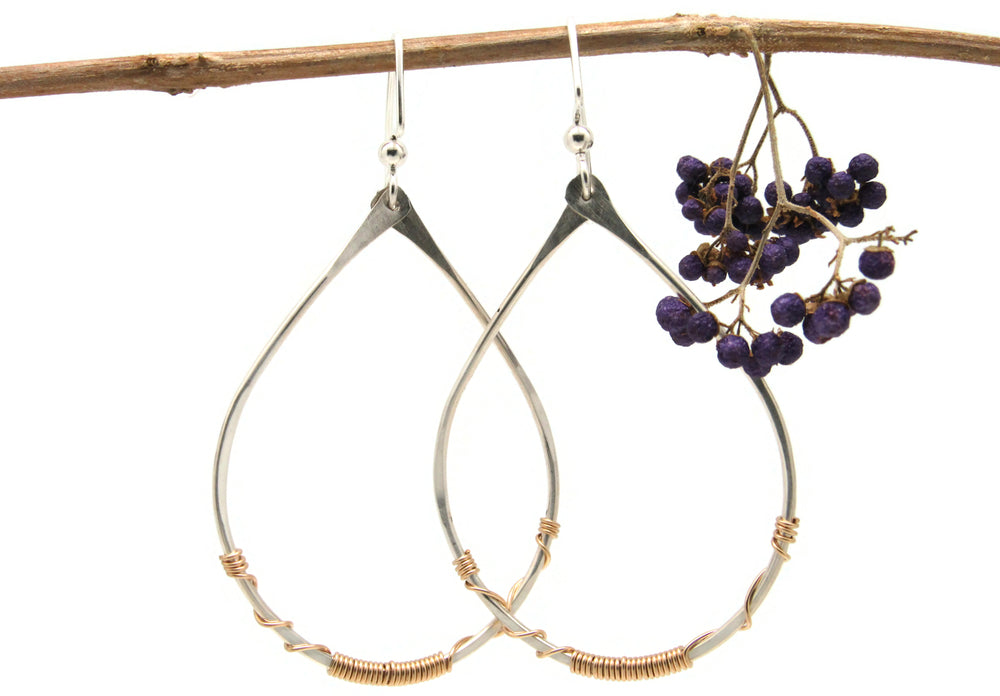 Forged sterling silver hoops are wrapped in coils of gold-filled wire.