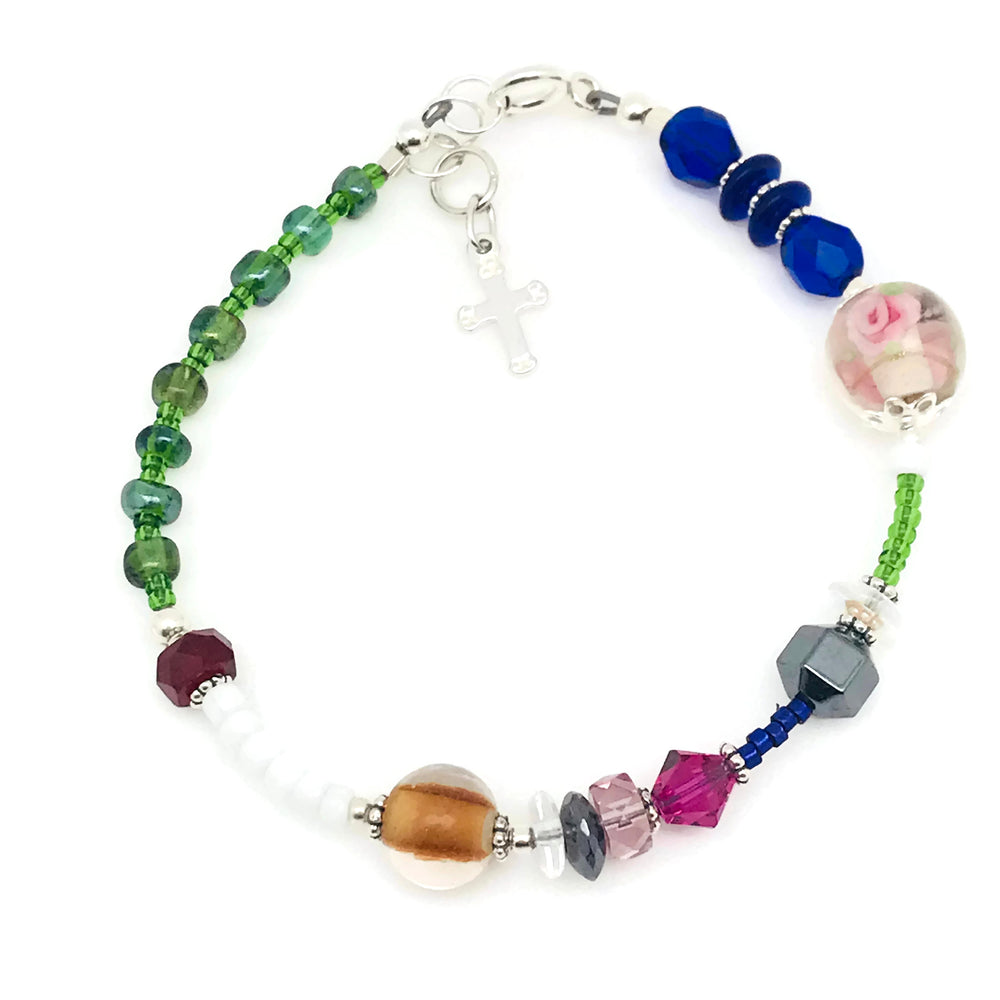 Our Women's Liturgical Church Year Prayer Bracelets are designed to represent the seasons of the Christian church calendar, beginning with Advent and ending with Christ the King Sunday. Individual bracelets will resemble the one pictured, but the beads on each bracelet are unique--just like our faith! Each bracelet is made with a combination of glass beads from around the world, Swarovski Austrian crystals, hematite and sterling silver spacers, clasp and cross.  Choose your size from 6.5 inches to 8.5 inches.  Each bracelet has a clasp chain that allows for half an inch of adjustment.