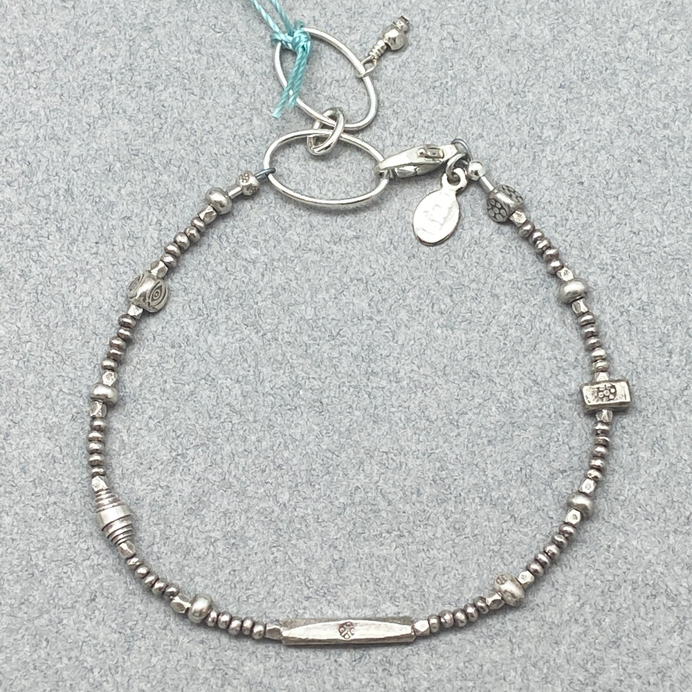 A strand of varied fine silver decorated beads from Thailand with an 7.25 - 8 inch adjustable sterling silver clasp and chain.