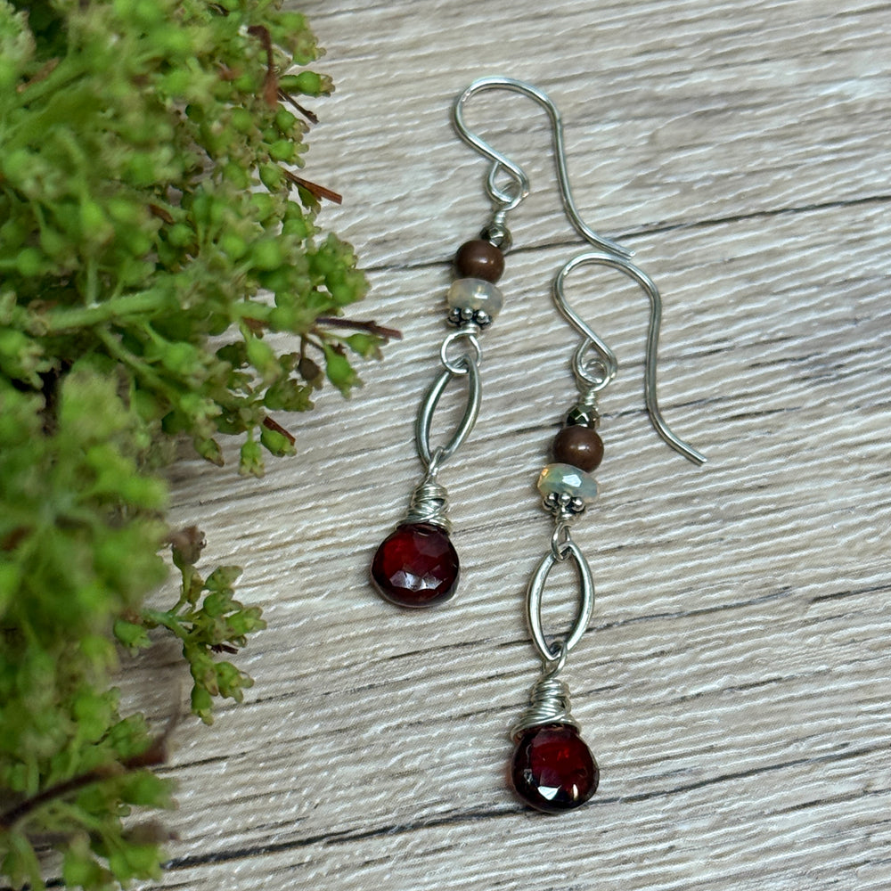 These three step earrings make a statement with faceted gemstones suspended by sterling silver. The eye-catching marquis drops, labradorite and decorated fine silver beads from Thailand provide a vibrant aesthetic. Choose from Ruby, Sleeping Beauty Turquoise, Garnet, or Tanzanite for a personalized look.