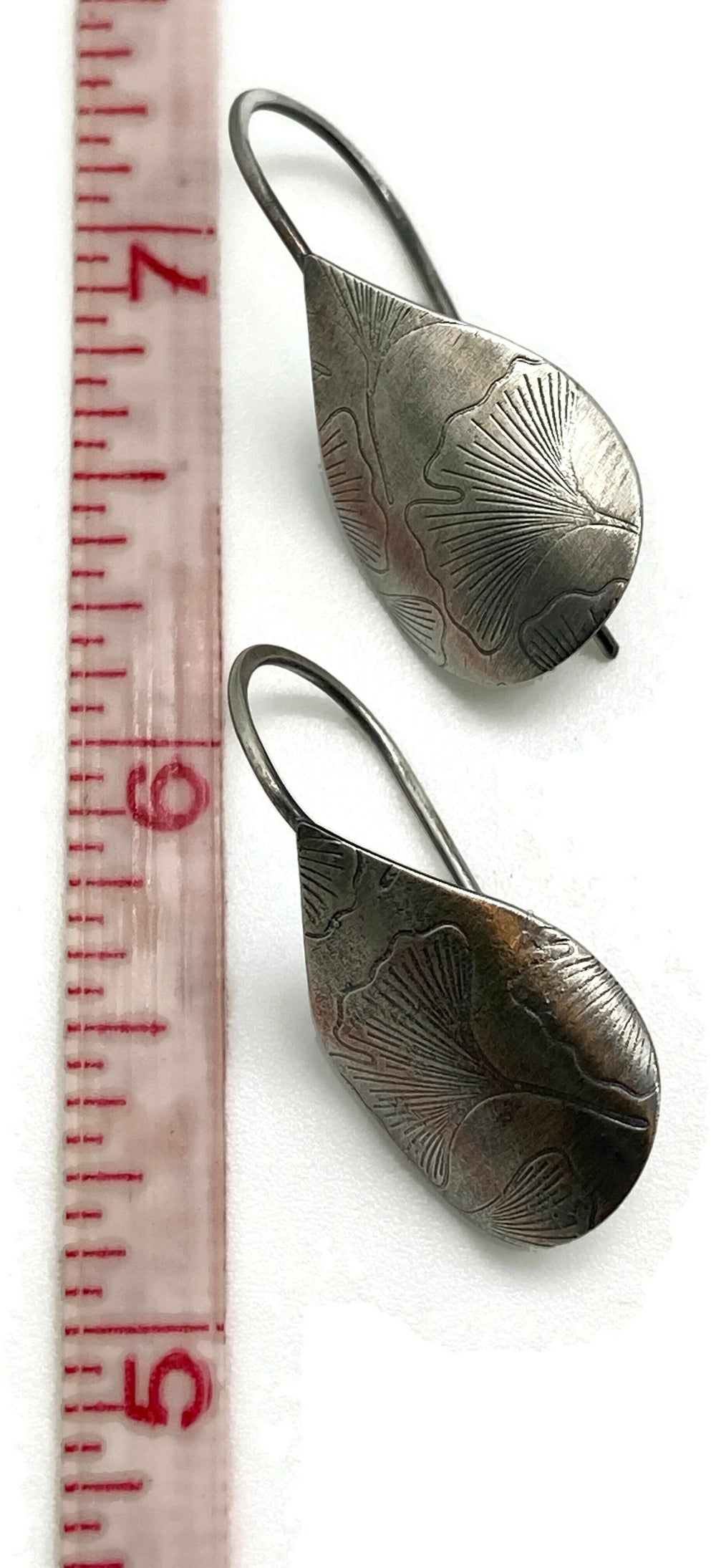 Gingko leaf textured sterling teardrops with their own soldered earwires have been oxidized to bring out the design.