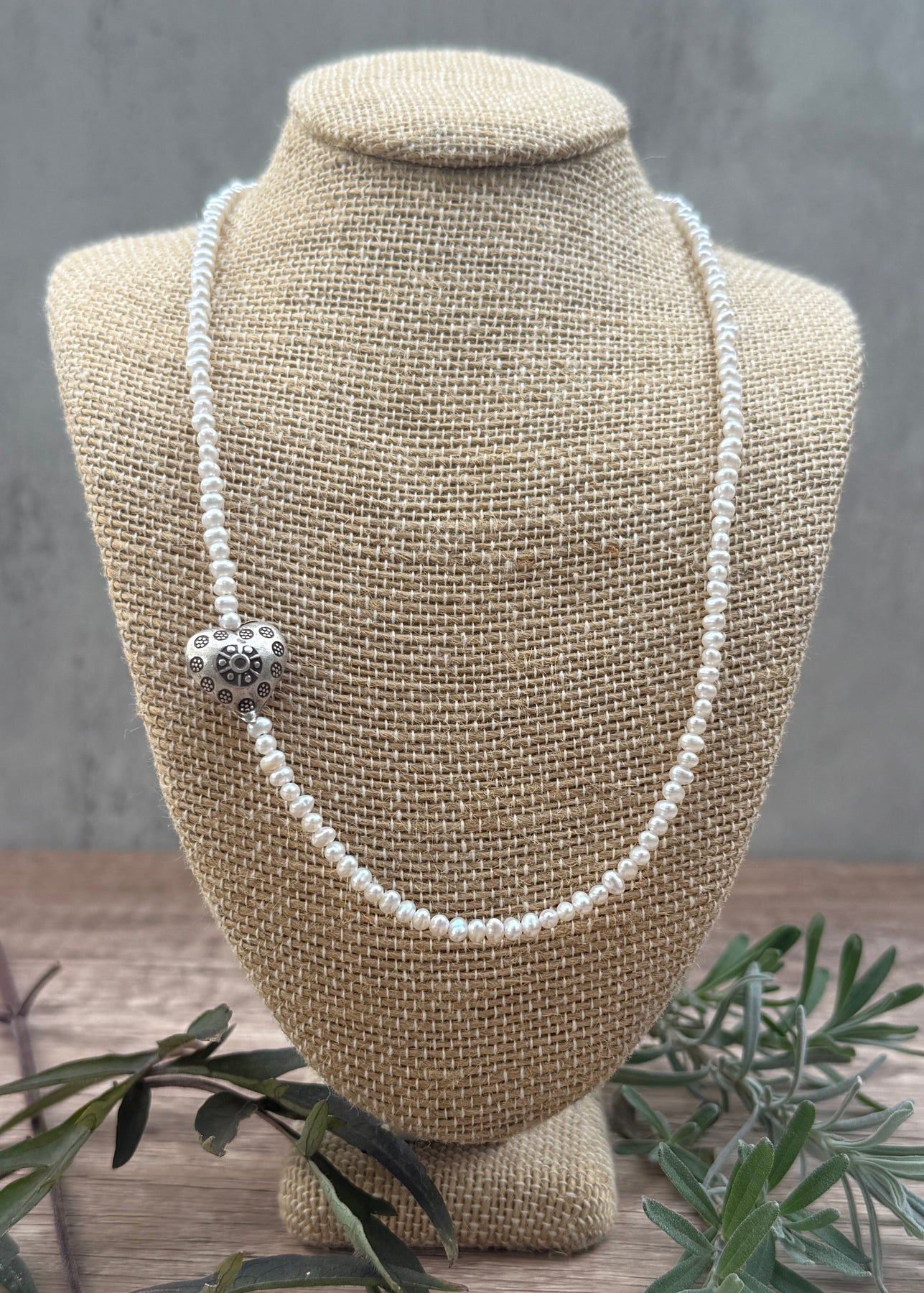 This playful necklace features a string of shimmering silver freshwater pearls, crowned with a charming puffed fine silver heart.
