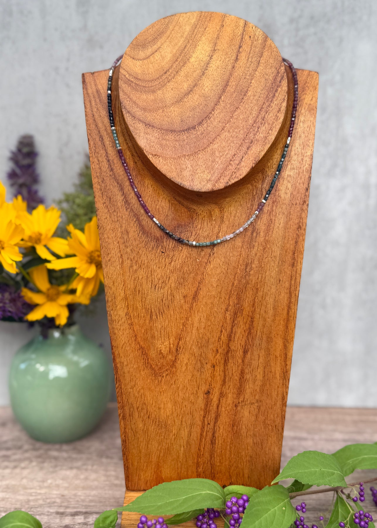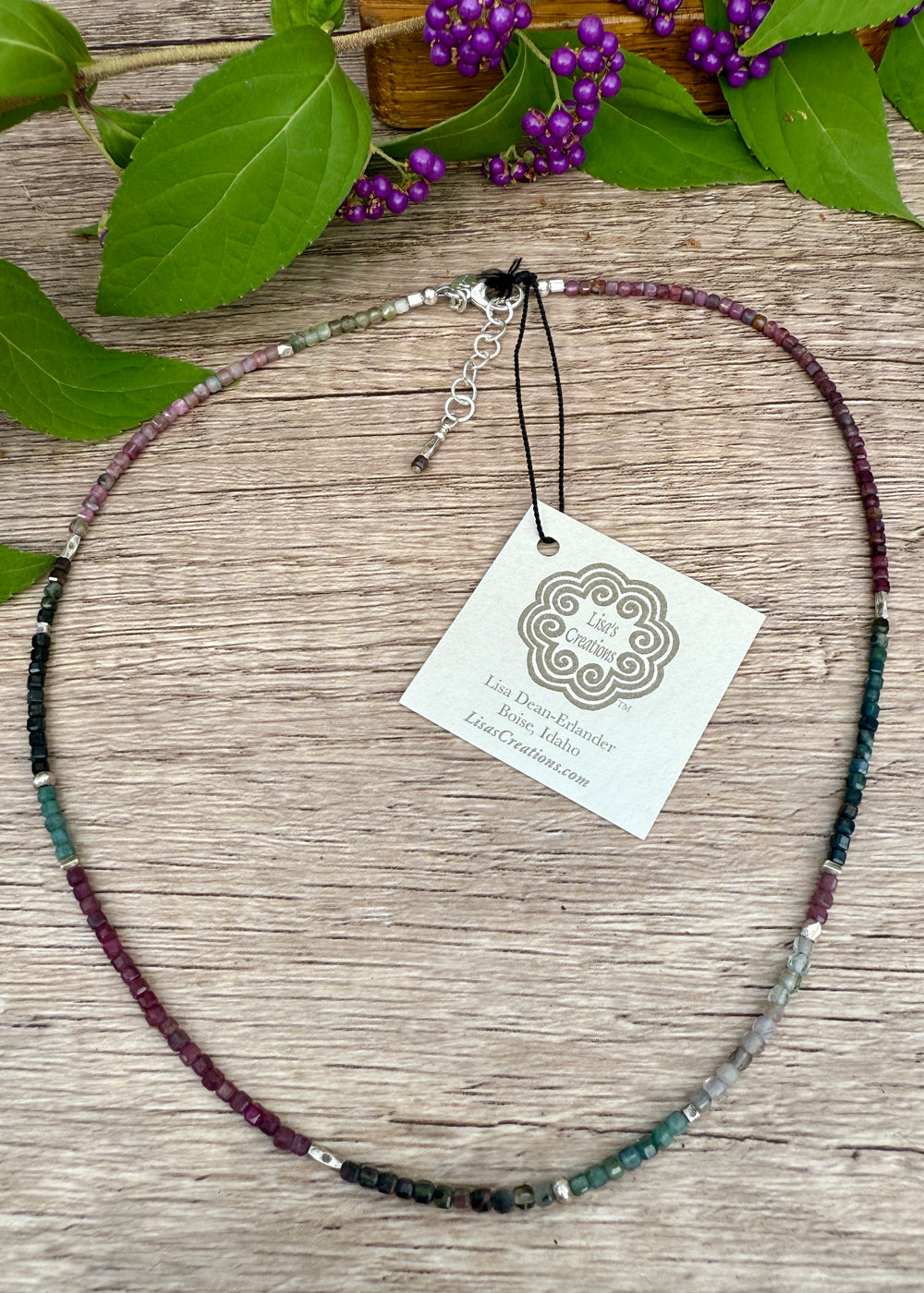 A rainbow of Tourmaline colors all in one necklace! Tiny squares of Tourmaline sparkle between fine silver beads from Thailand..