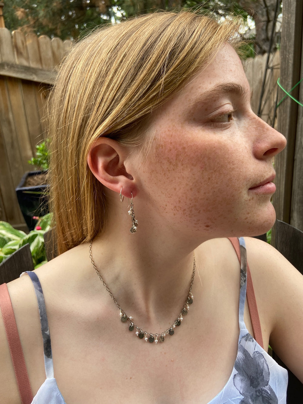 Tiny freshwater pearls accompany textured sterling discs on these light and lovely fringe earrings. Lisa creates each sterling disc by texturing sheets of recycled sterling silver with a rolling mill; then cutting, shaping, polishing, finishing and forming a patina on the surface using a chemical reaction with liver of sulfur. Each pair is one of a kind, but similar to the one pictured. Coordinating necklaces may be found on my website.