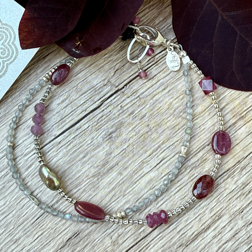 Upgrade your wrist game with our stunning Pinks and Pearl Double Bracelet. This elegant accessory combines two strands of gemstones: the first strand boasts fine silver beads from Thailand with a mix of pink natural stones, while the second strand sparkles with tiny faceted labradorites. Add some shine to any outfit with this must-have piece!