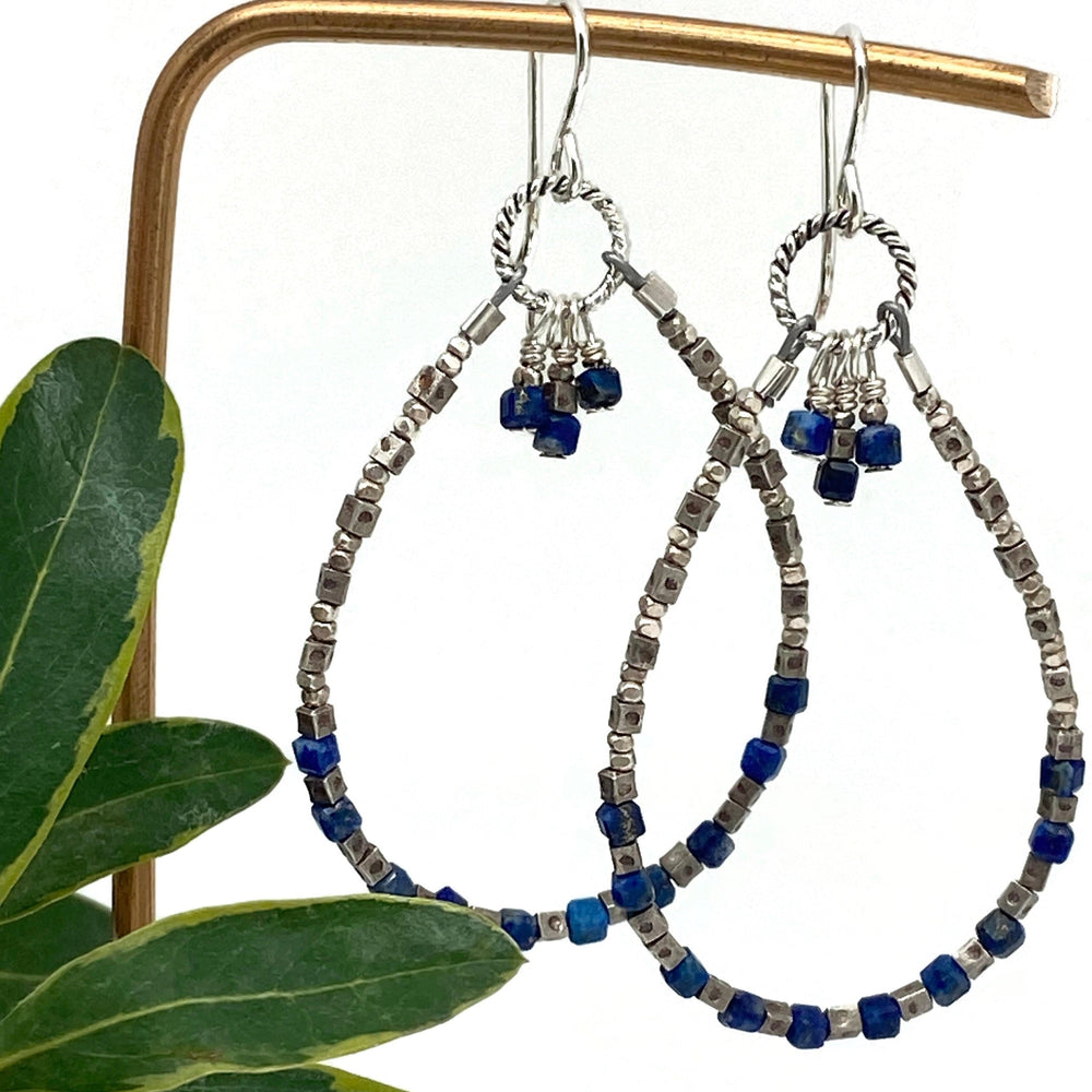 Our fashionable Gemstone Hoop Earrings are crafted with fine silver beads from Thailand and set with tiny gemstone nuggets. Choose from Nacozari Turquoise, Ruby, Lapis Lazuli or Labradorite to match any style. Perfect for special occasions or everyday wear.