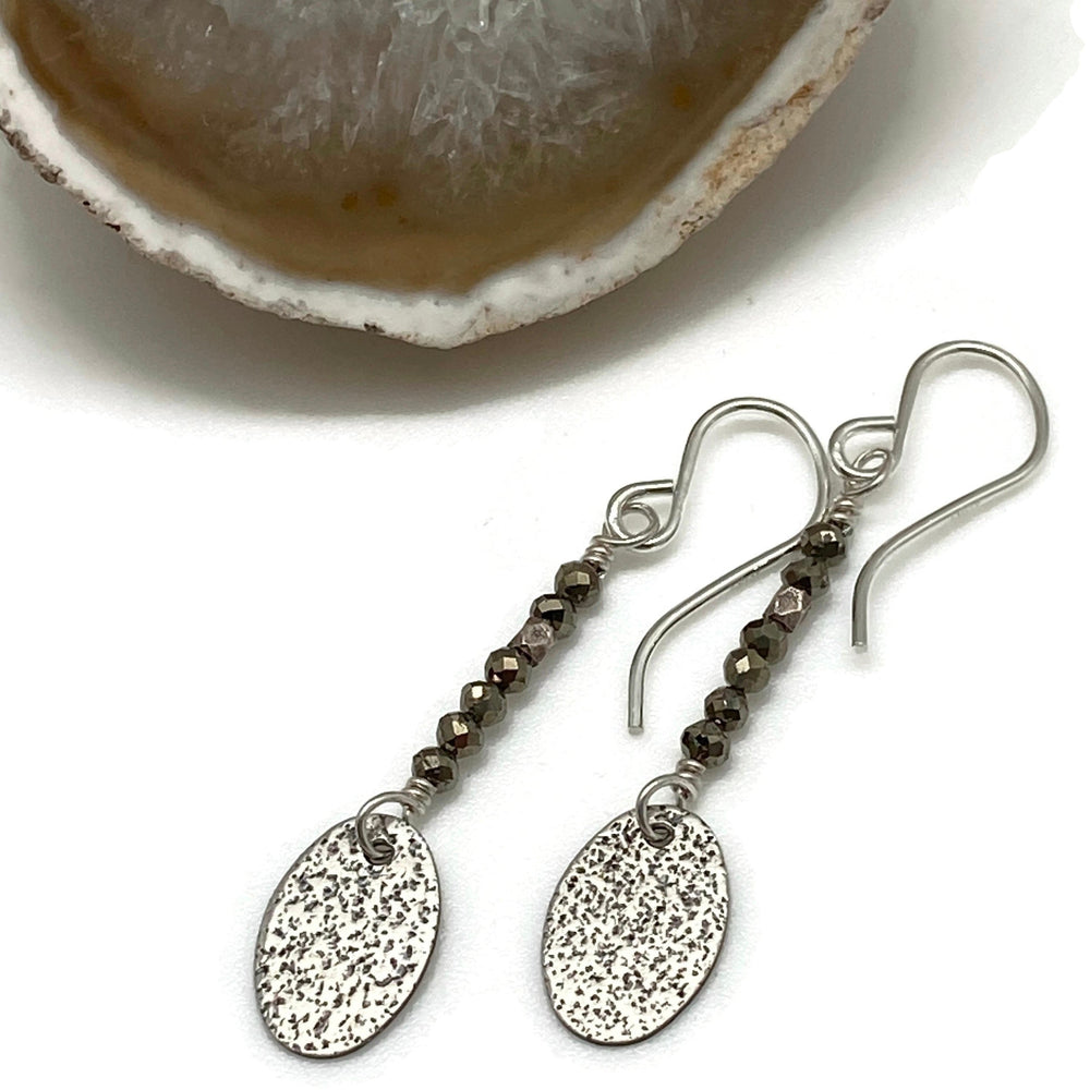 Our Elliptical Earrings feature a textured sterling silver oval below a stack of tiny gemstones and sterling spacer, giving you a delicate yet eye-catching look. Their unique design adds a subtle pop of color to any outfit.