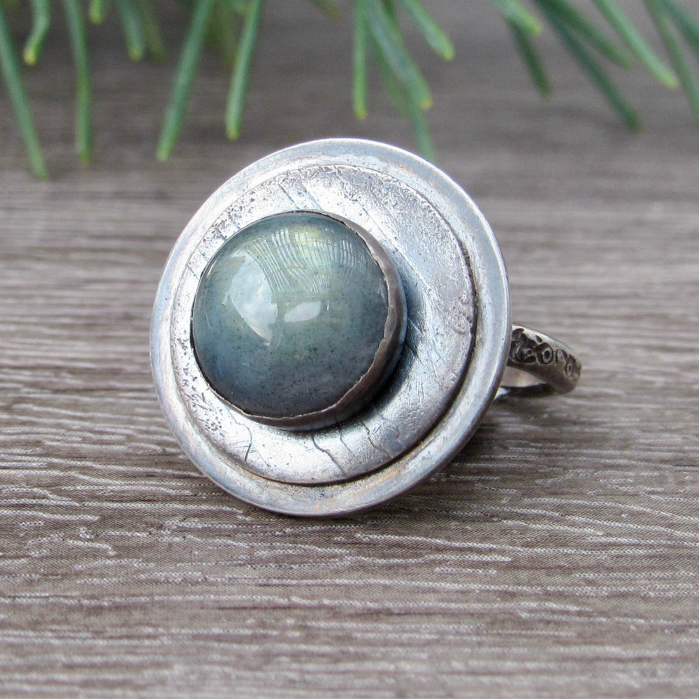 This Labradorite ring features a round cut labradorite set in a double circle of hand textured sterling silver. Crafted with expertise and attention to detail, each ring is as individual as its wearer.