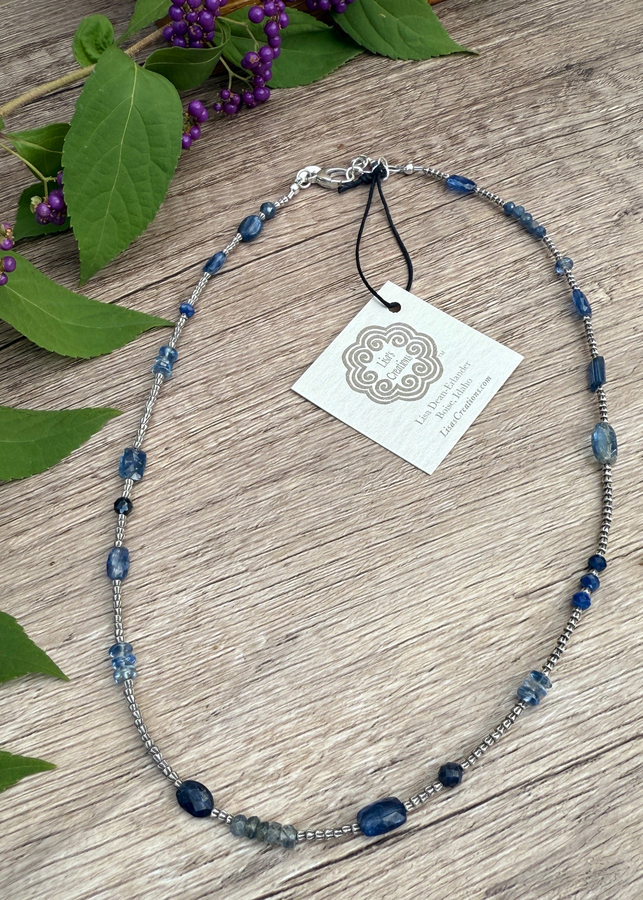 This necklace features clusters of blue gemstones, elegantly spaced with intricately detailed fine silver beads from Thailand, showcasing a variety of Kyanite and Sapphire shapes.